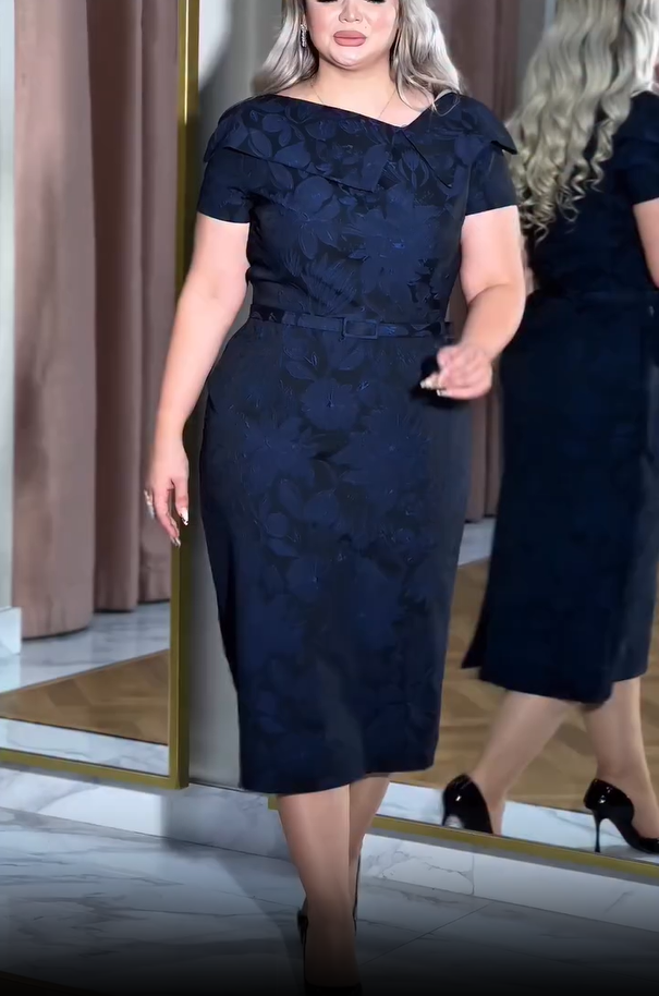 This dress features a subtle floral pattern and an asymmetrical neckline, combined with a fitted waist and a matching belt to accentuate a refined figure. The fabric drapes beautifully, and gold accents add a touch of elegance, resulting in a look that blends classic sophistication with modern style.