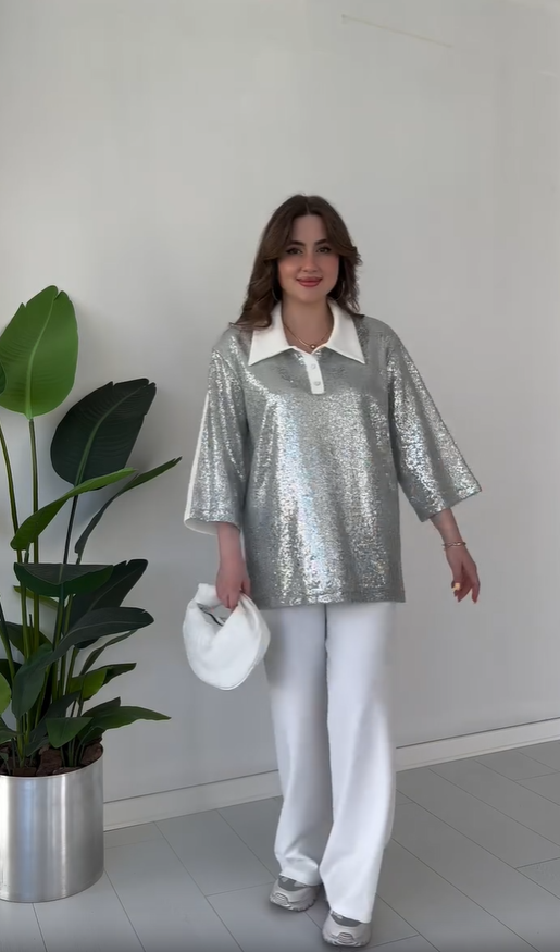This women's casual set features a simple cut that outlines an elegant figure, with delicate shimmering fabric creating a low-key luxury feel, and a gentle luster flowing in the sunlight.