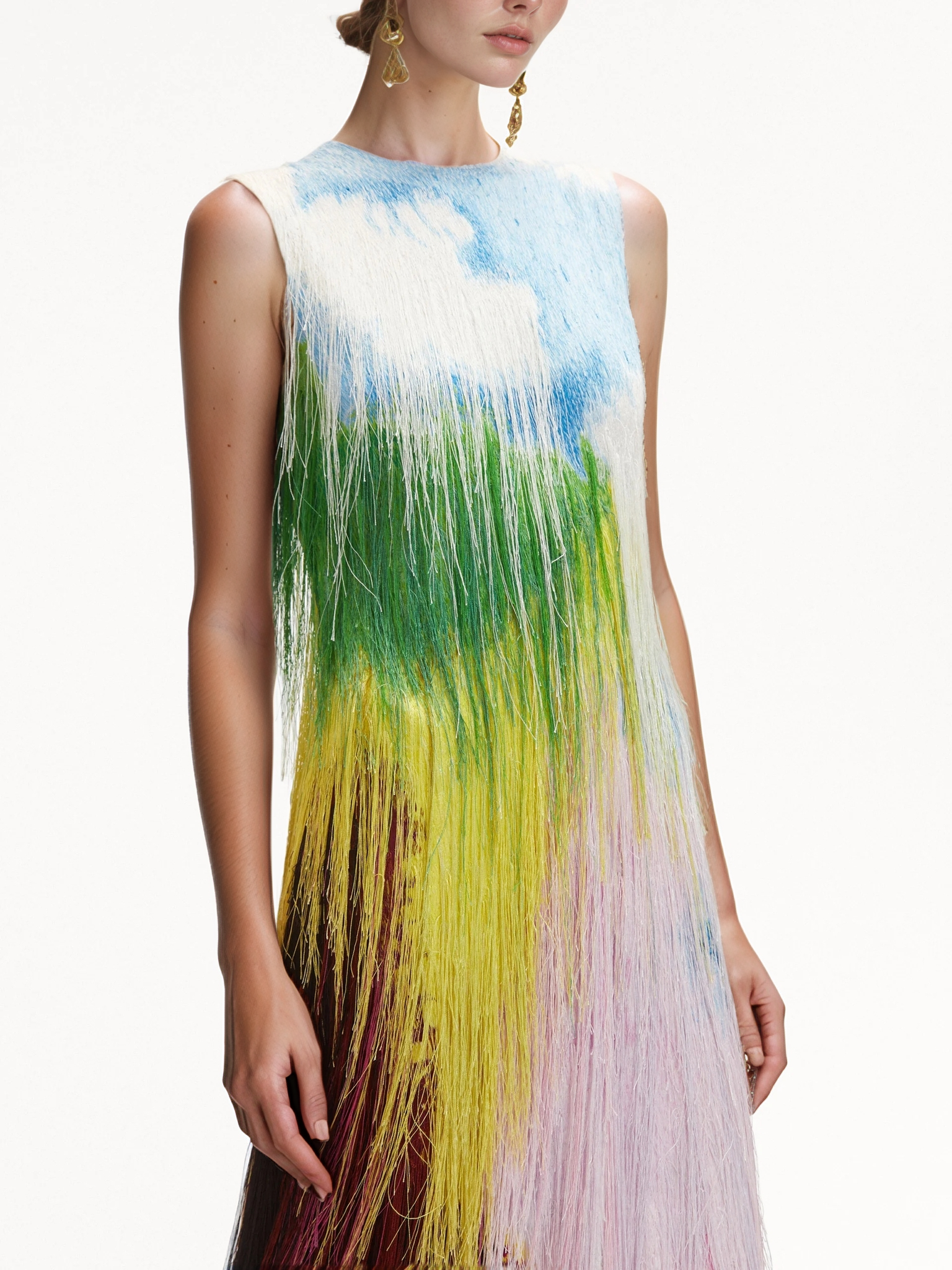 Meticulously hand-embroidered with colorful silk fringe, it looks like a beautiful watercolor painting.