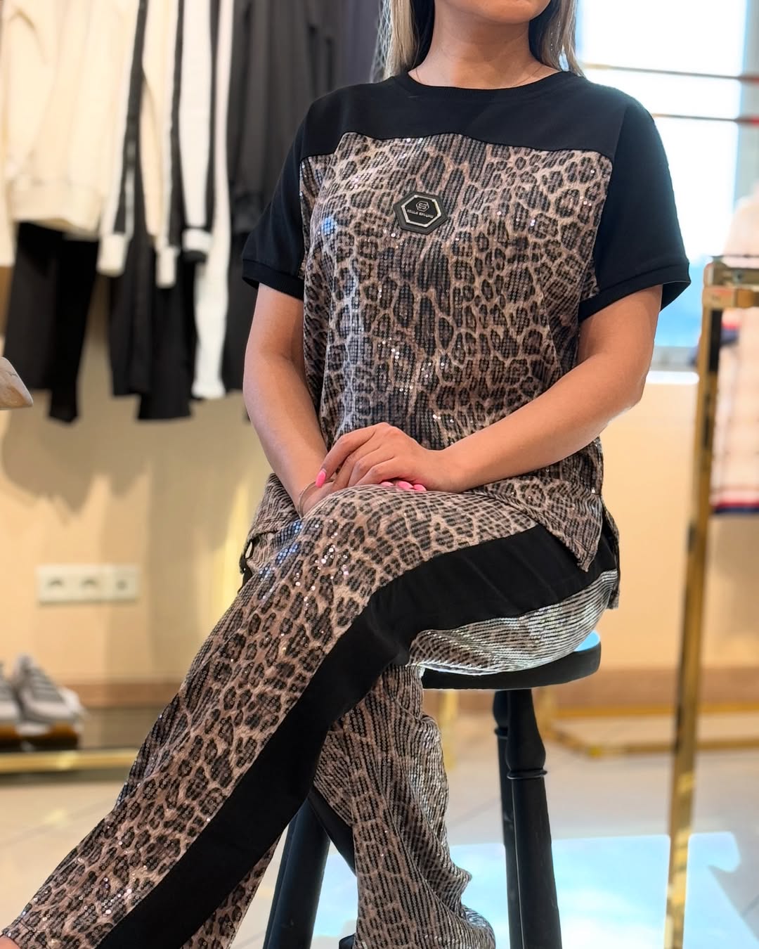 Fashionable women's summer leopard print patchwork sequin top and pants