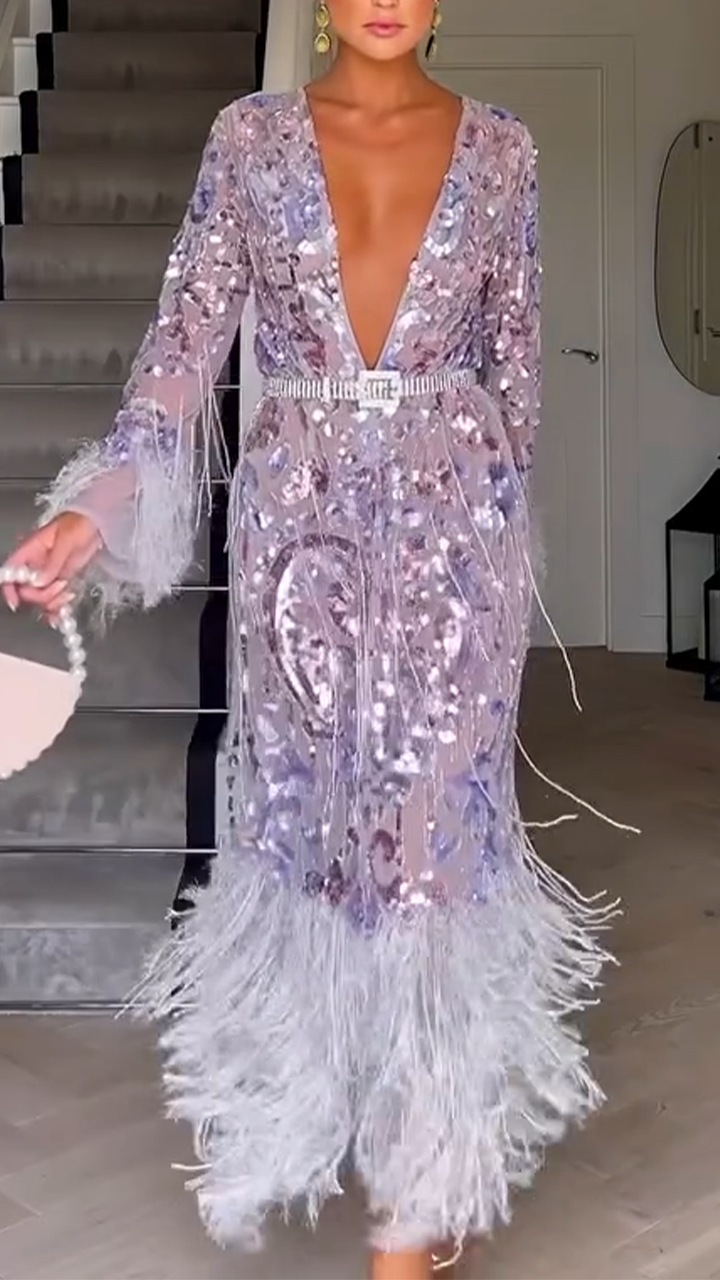 Ladies' Deep V-neck Sequined Patchwork Tassel Elegant Evening Dress