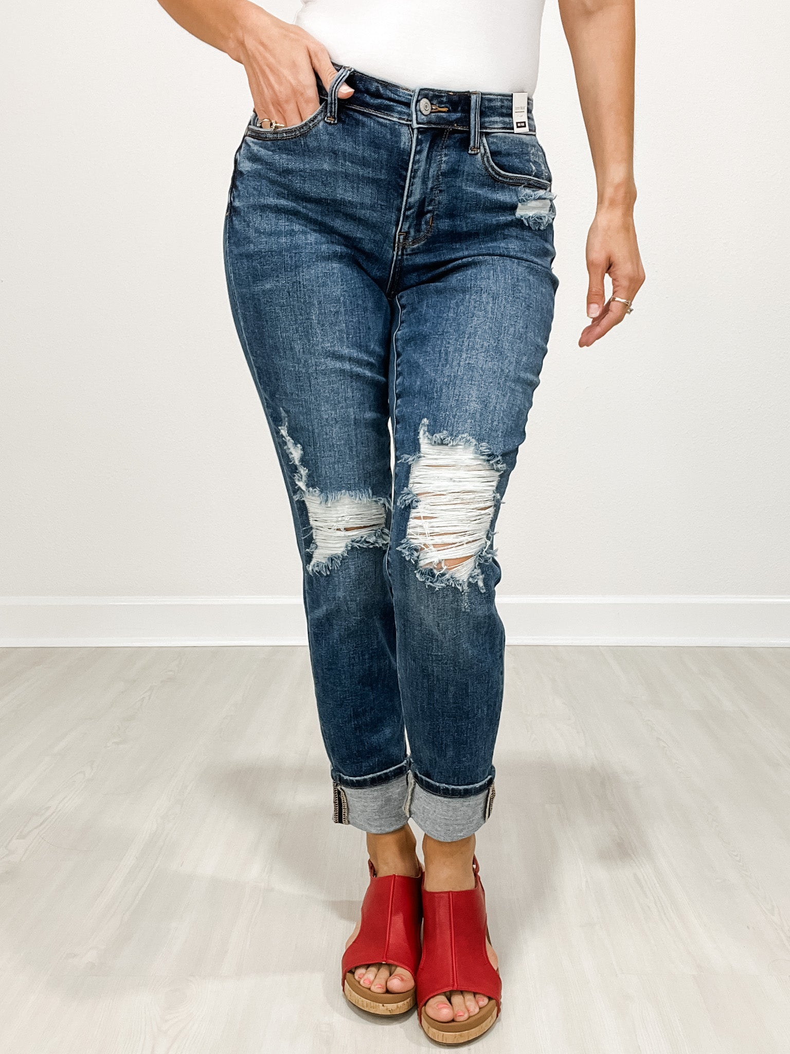 Featuring a relaxed fit and mid-rise waist, these jeans offer a flattering silhouette with trendy distressed detailing and a cuffed hem.