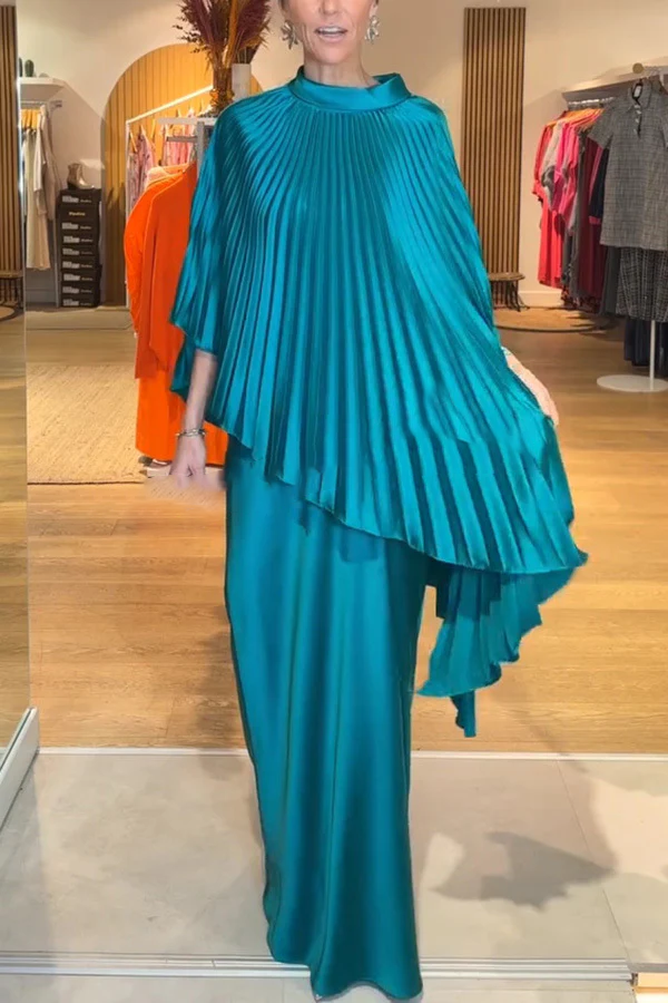 Satin Solid Color Pleated Loose Cape and Elegant Maxi Skirt Set