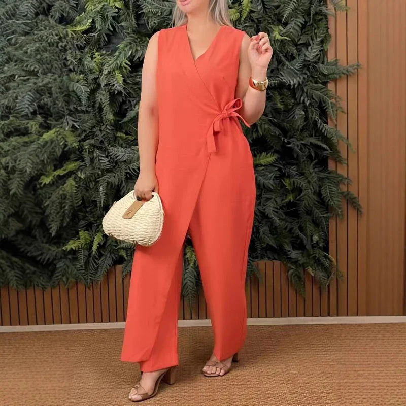 Jumpsuit is the outfit you need to effortlessly stand out! This jumpsuit features a V-neck design that enhances the neck line and an adjustable waistband that outlines your silhouette, blending elegance and freshness together。
