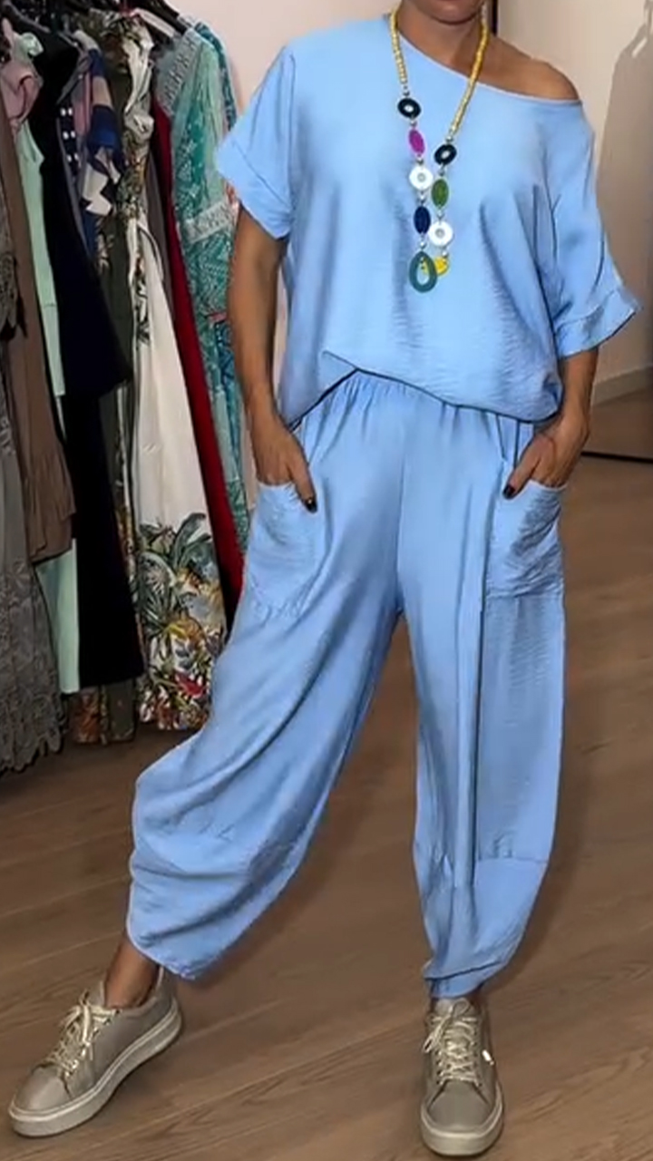 Summer Women's Round Neck Shoulder Solid Color Loose Set