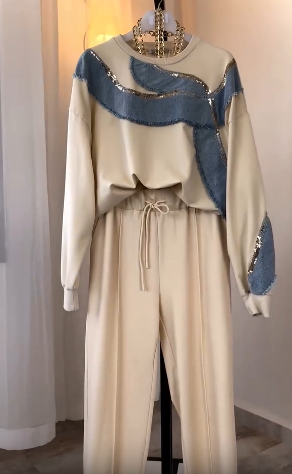 Women's denim splicing color blocking casual set