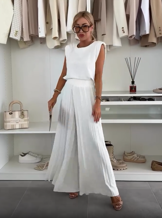 Women's Fashion Round Neck Sleeveless Top Pleated Wide Leg Pants Two-Piece Set
