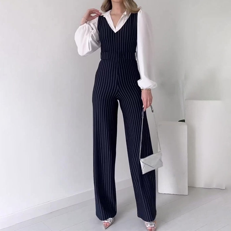 FAUX TWO-PIECE LOOK: The top portion of the jumpsuit offers a faux two-piece effect with a vest layered over a white shirt. This design adds a high level of style, making the outfit look both elegant and formal, while actually being a single piece.